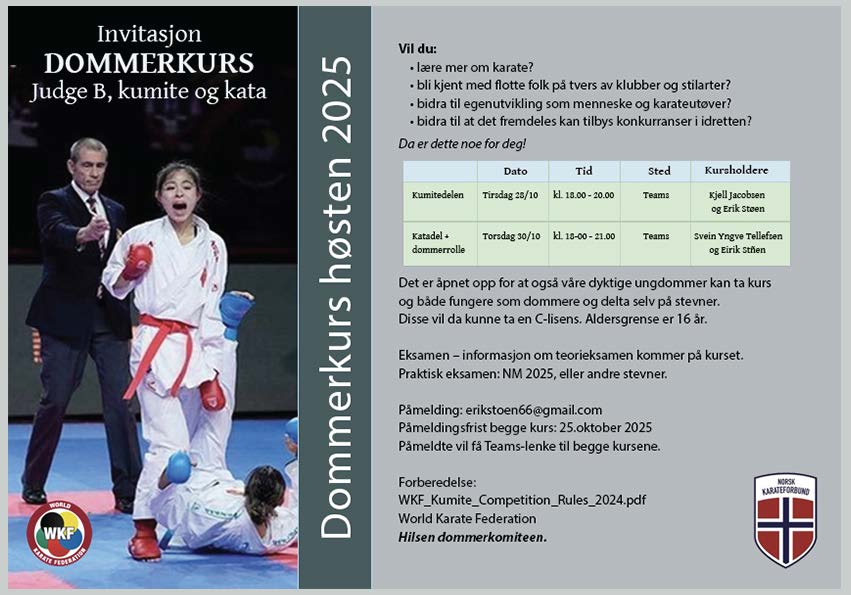 Dommerkomiteen inviterer til dommerkurs for Judge B i Kata og Kumite 28. og 30. oktober på Teams. Norsk Karateforbund trenger flere dommere så her er det bare å benytte muligheten og melde seg på. Påmeldingsfrist 25. oktober til leder i dommerkomiteen erikstoen66@gmail.com